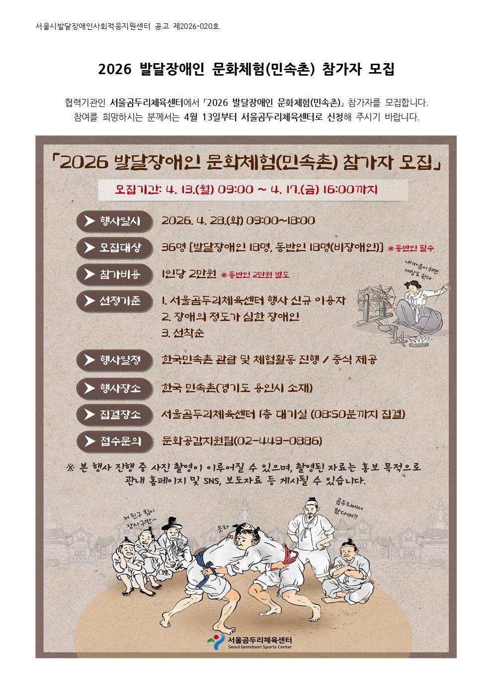 서울곰두리체육센터 발달장애인 문화체험(민속촌) 참가자 모집