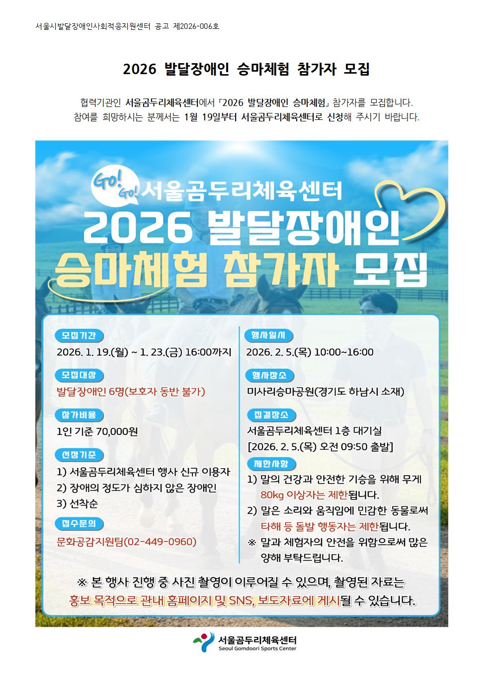 서울곰두리체육센터 발달장애인 승마체험 참가자 모집